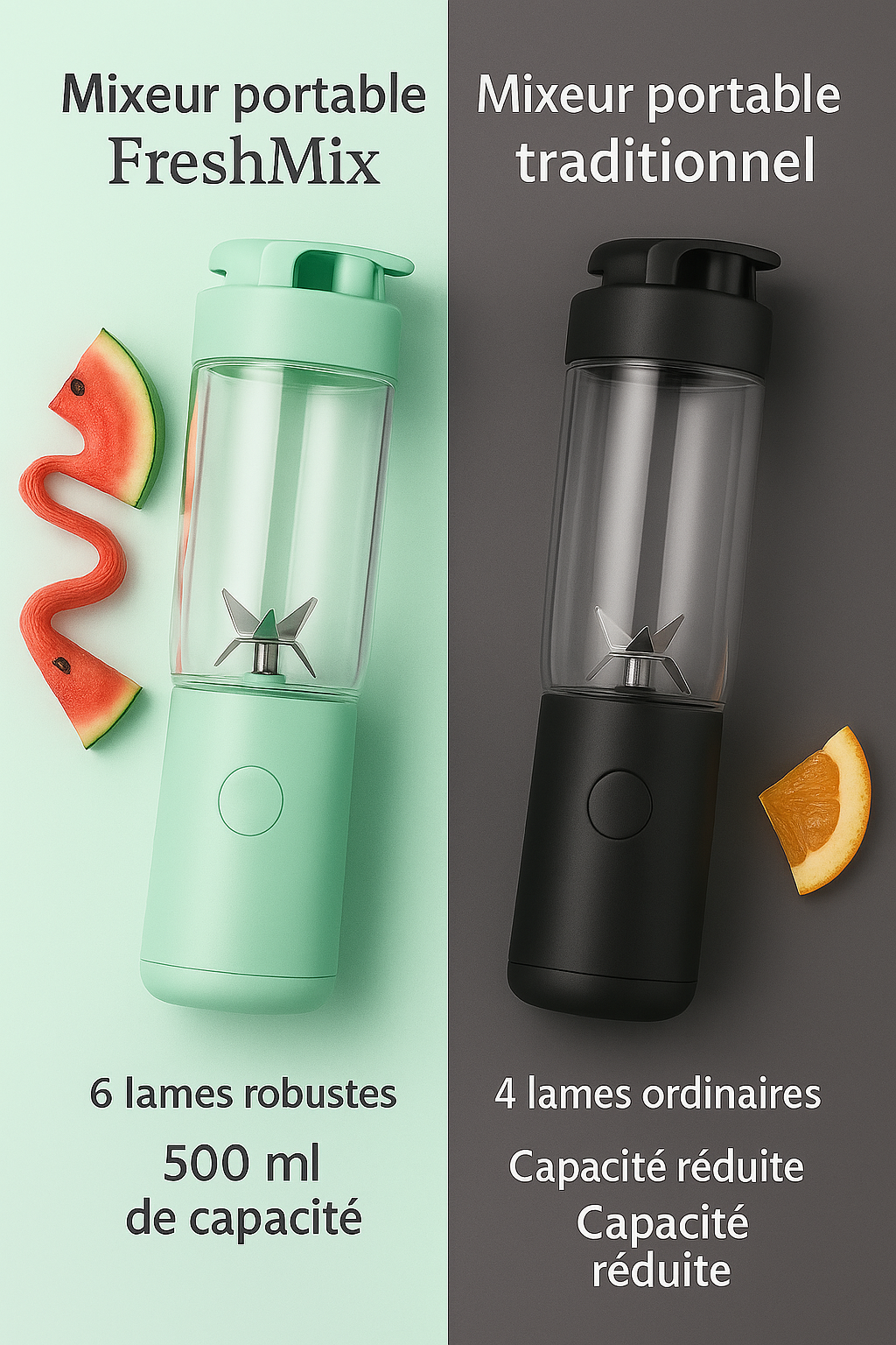 Absolument ! Léger, compact et rechargeable par USB, FreshMix est conçu pour être emporté partout : bureau, salle de sport, voiture, voyage, ou pique-nique.